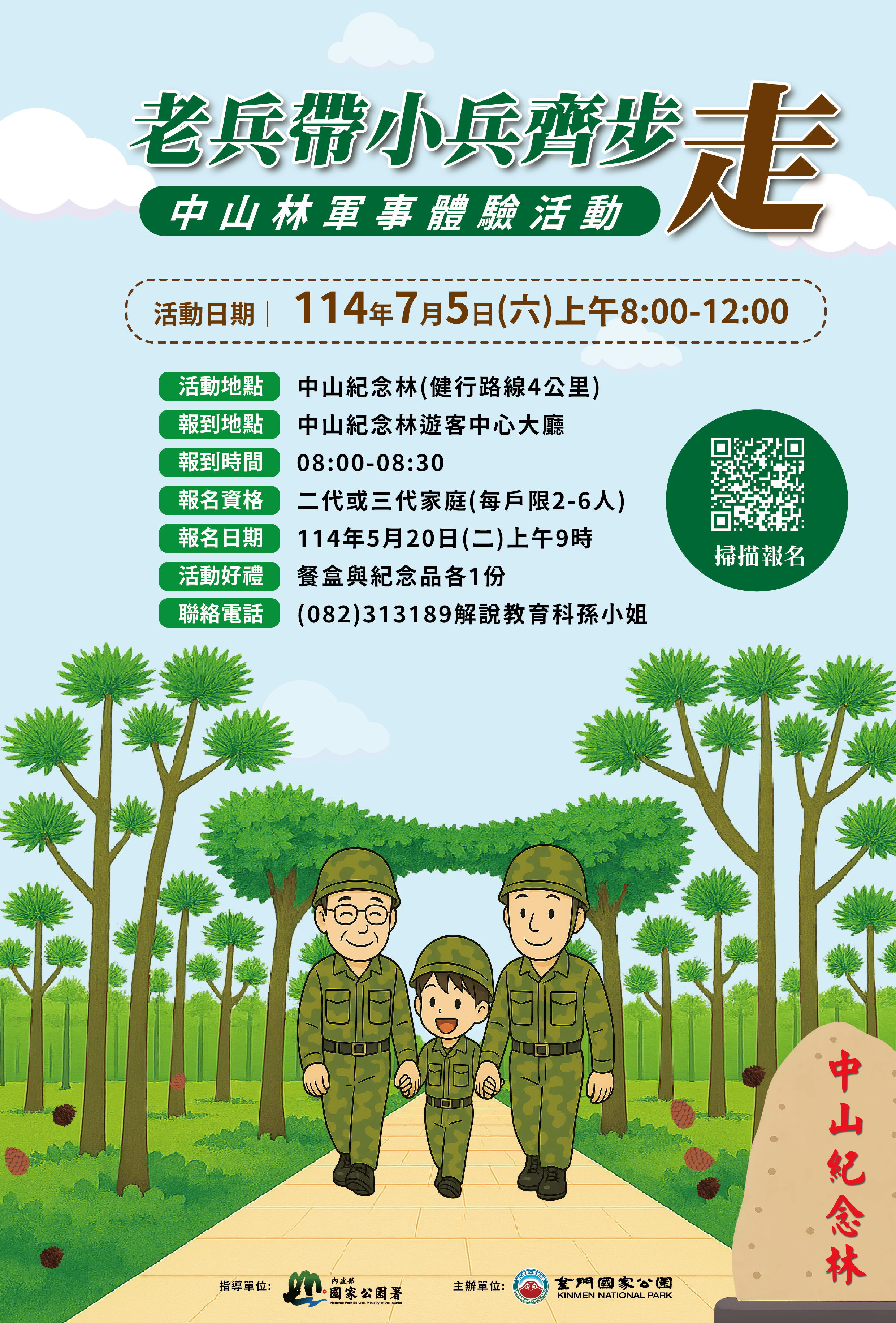 內政部國家公園署金門國家公園管理處,為使民眾近距離體驗軍事文化生活,預定於114年7月5日(星期六)上午8時假中山紀念林辦理「老兵帶小兵齊步走-中山林軍事體驗活動」,邀請三代(或二代)同堂家庭一起健走中山紀念林,體驗賈村戰技體驗場,讓民眾走進大自然迎向健康,放鬆身心愛上國家公園,同時增進三代親子互動相處時光。