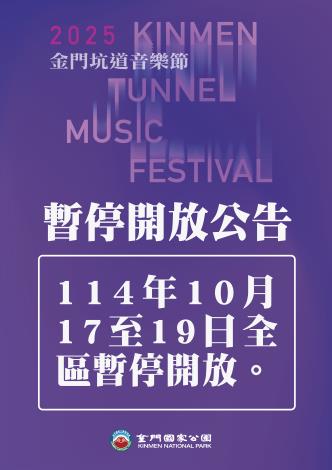 內政部國家公園署金門國家公園管理處(下稱金管處)於114年10月18至19日辦理「2025年金門坑道音樂節」,為籌備活動相關事宜,翟山坑道將於10月17至19日暫停開放。金管處表示,暫停開放範圍為翟山坑道全區(含戶外武器展示區與觀海步道),另為維護活動當日交通流暢,活動期間將進行車輛管制,10月20 ...更多